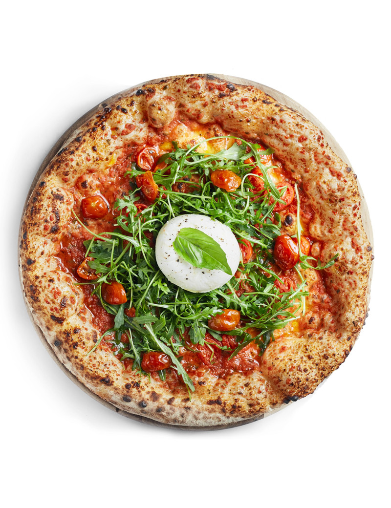 Sauce tomate, mozzarella, tomates cerises, roquette, burrata, basilic , huile d'olive extra vierge, origan