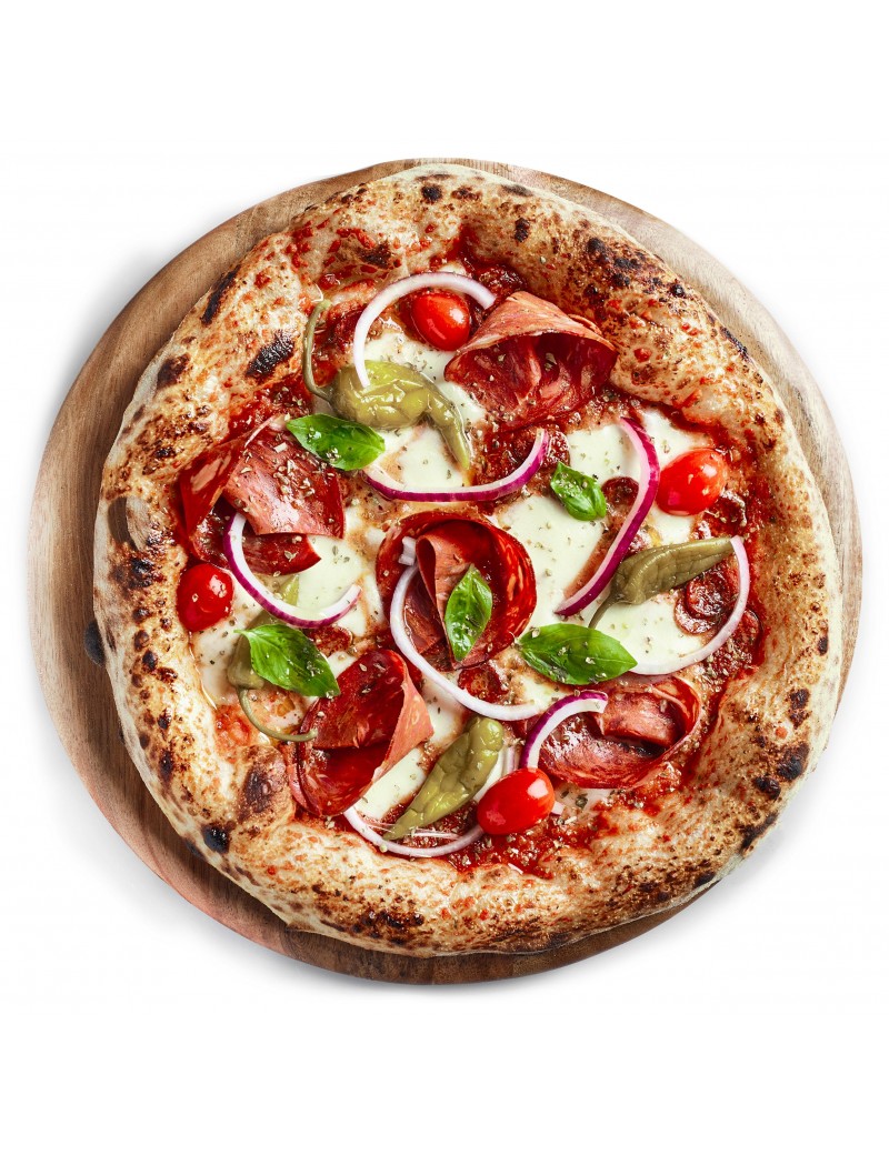 Sauce tomate, mozza, chorizo de boeuf, merguez, oignons rouges et piments vinaigrés