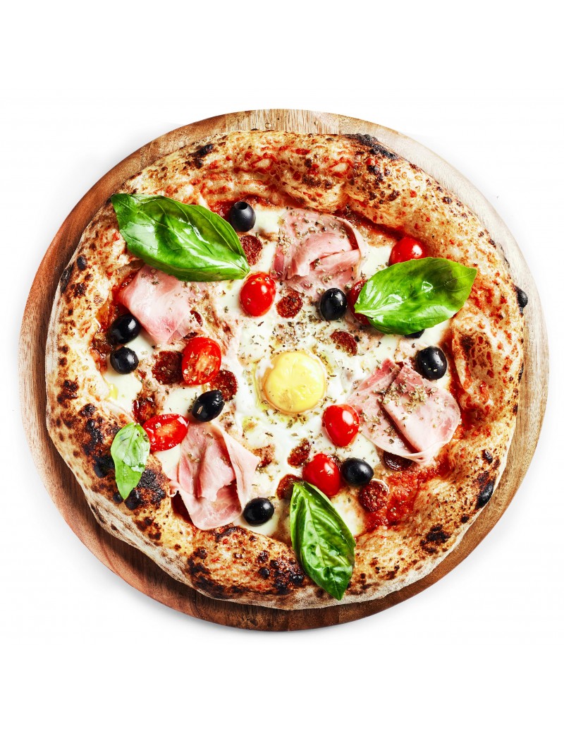 Sauce tomate, mozzarella, merguez, jambon de dinde et oeuf, origan