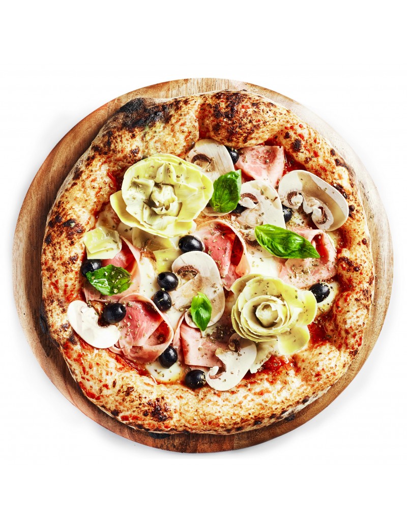 Sauce tomate, mozzarella, jambon de dinde, champignons, artichauts marinés et olives noires, origan
